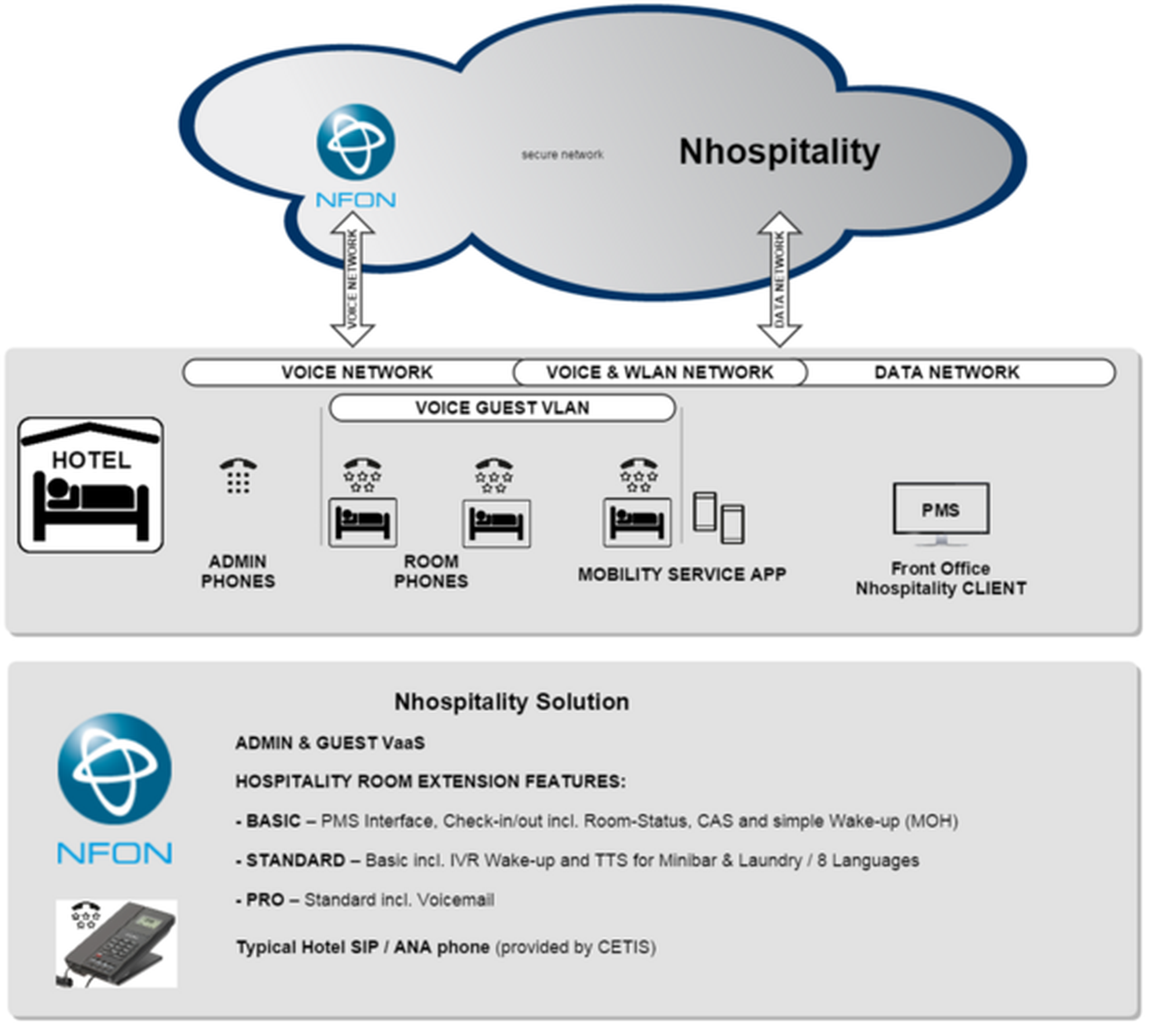 NFON AG macht Hotels fit für die Cloud. Nhospitality die Lösung für effiziente Kommunikation. Mit dem Zusatz Nhospitality zur NFON Telefonanlage stellt die NFON AG dem Kunden während der Vertragsdauer die Dienste eines zentralen, virtuellen, VoIP-basierten und auf das Gastgewerbe spezialisierten Middleware Service zur Verfügung. Middleware bedeutet hier die Applikationsschicht welche zwischen dem führenden Hotelsystem (PMS) und der NFON Telefonanlage vermittelt und hotelspezifische Funktionen zu Verfügung stellt.