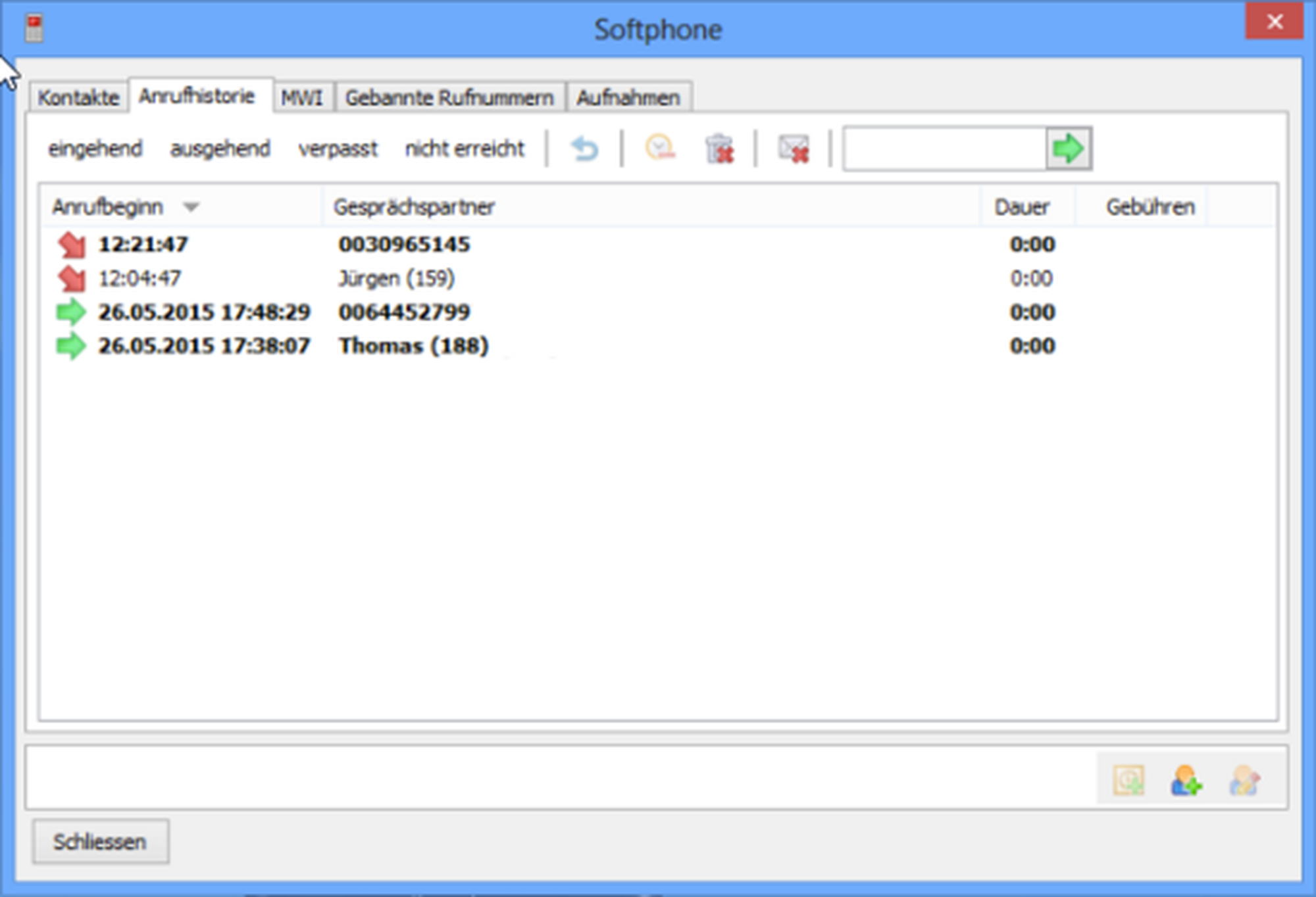 You are able to open your contacts by clicking the button "Phonebook / Call history". Subsequently, a window with all available contacts appears.