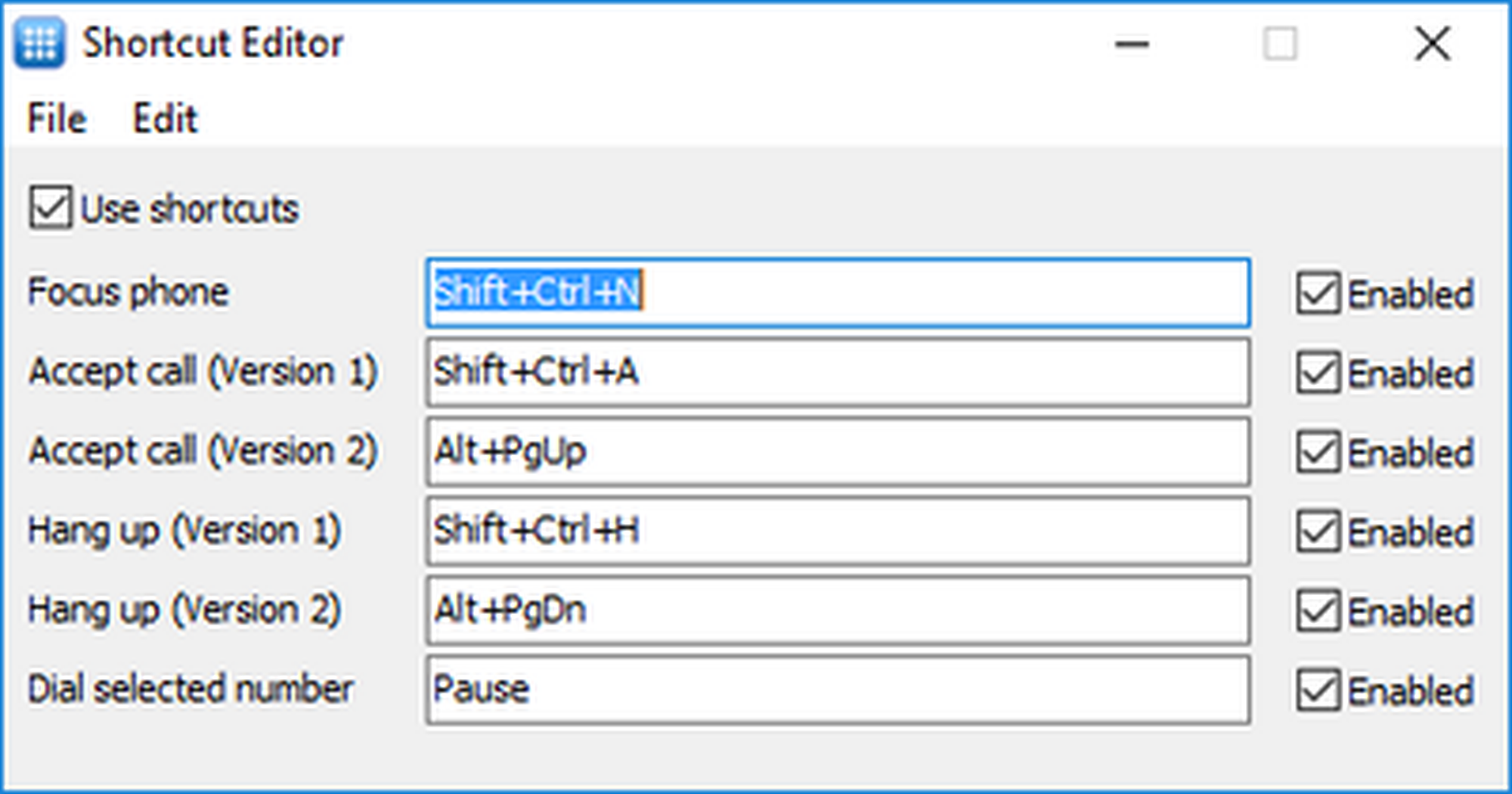 The Softphone has a shortcut editor, which offers the possibility to define your own shortcuts.