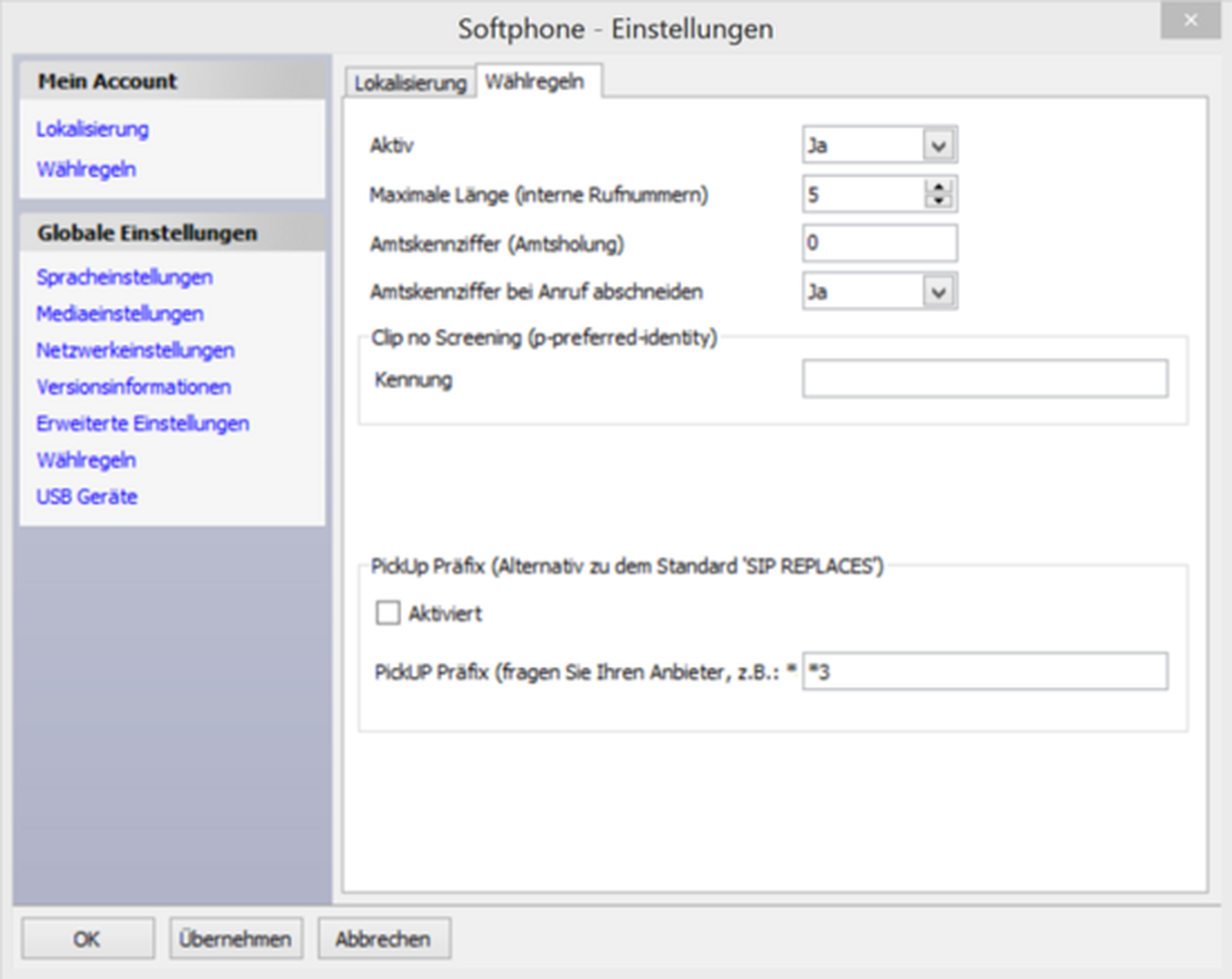In order to define the dialing rules for your softphone, open the settings menu of your Nsoftphone standard client by clicking on the symbol and select the tab "Dialing rules".